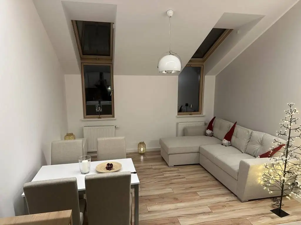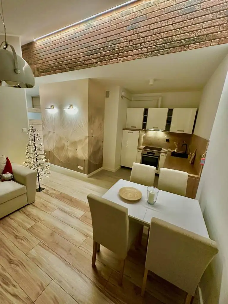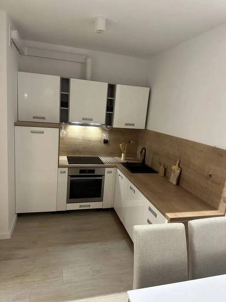 Przestronny i jasny, z pełnym wyposażeniem kuchni: zmywarka, lodówka, płyta indukcyjna.