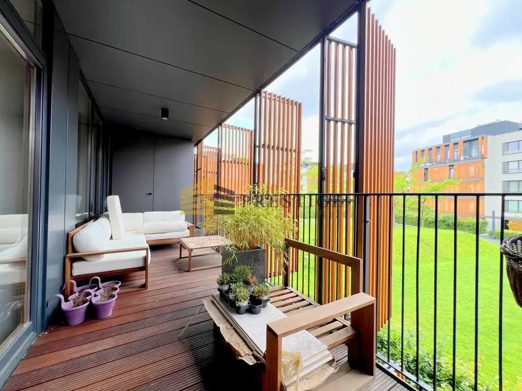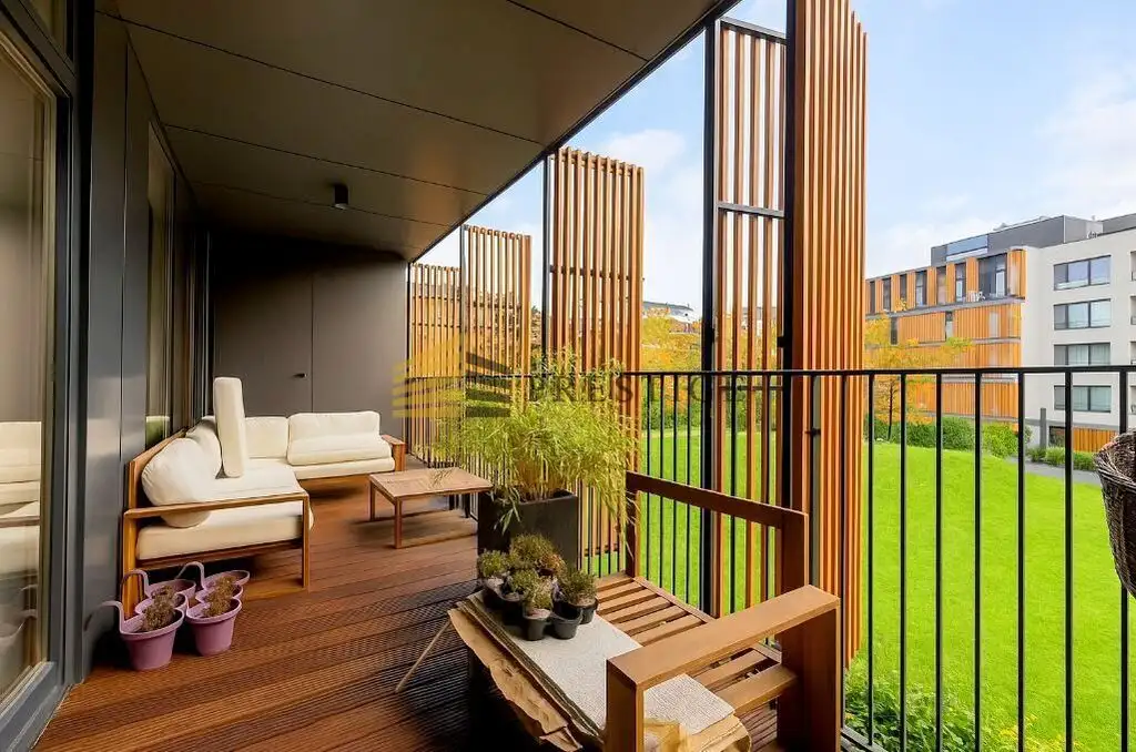 practical wardrobe. The living room and dining room open onto a spacious, 20-meter terrace with a picturesque view of the green patio. The terrace is equipped with stylish wooden shutters that can be freely adjusted, adjusting the amount of light and privacy to your own needs. An additional, smaller balcony is located by the children's bedrooms, providing an ideal place for morning coffee or a moment of relaxation.