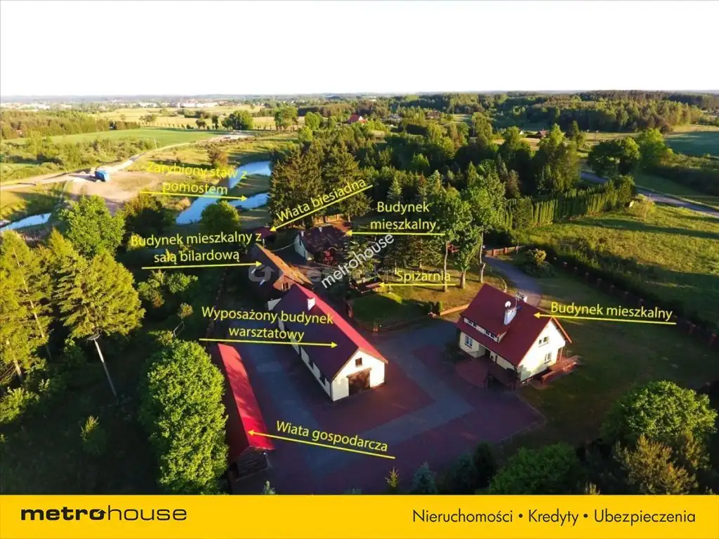 Prezentowana nieruchomość obejmuje grunt o powierzchni .5 ha 1400 m² , trzy budynki mieszkalne, budynek warsztatowo gospodarczy, jezioro - staw, o powierzchni ok. 7000 m² z pomostem.