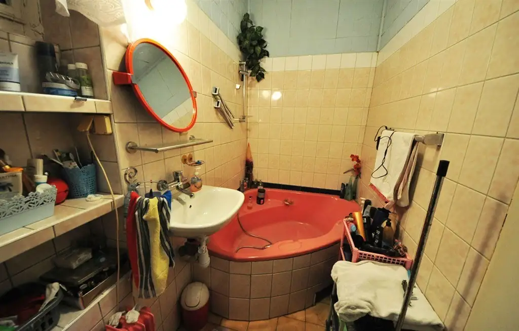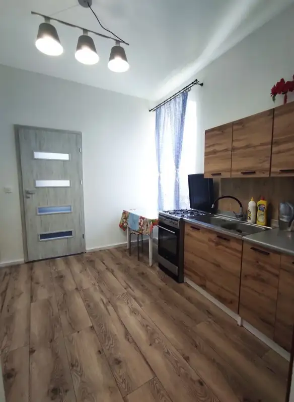 Po remoncie w 2023r jest łazienka, kuchnia oraz pokój duży. W pozostałych pokojach i kuchniach, podłogi drewniane z desek oraz paneli. W holu na parterze posadzka z płytek terakota.