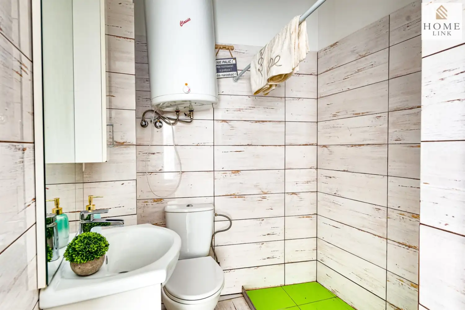 Część mieszkalna jest również w dobrym stanie technicznym. Wymienione zostały instalacje elektryczne i hydrauliczne. W salonie i pokojach na podłodze panele, w łazience i aneksie kuchennym terakota.