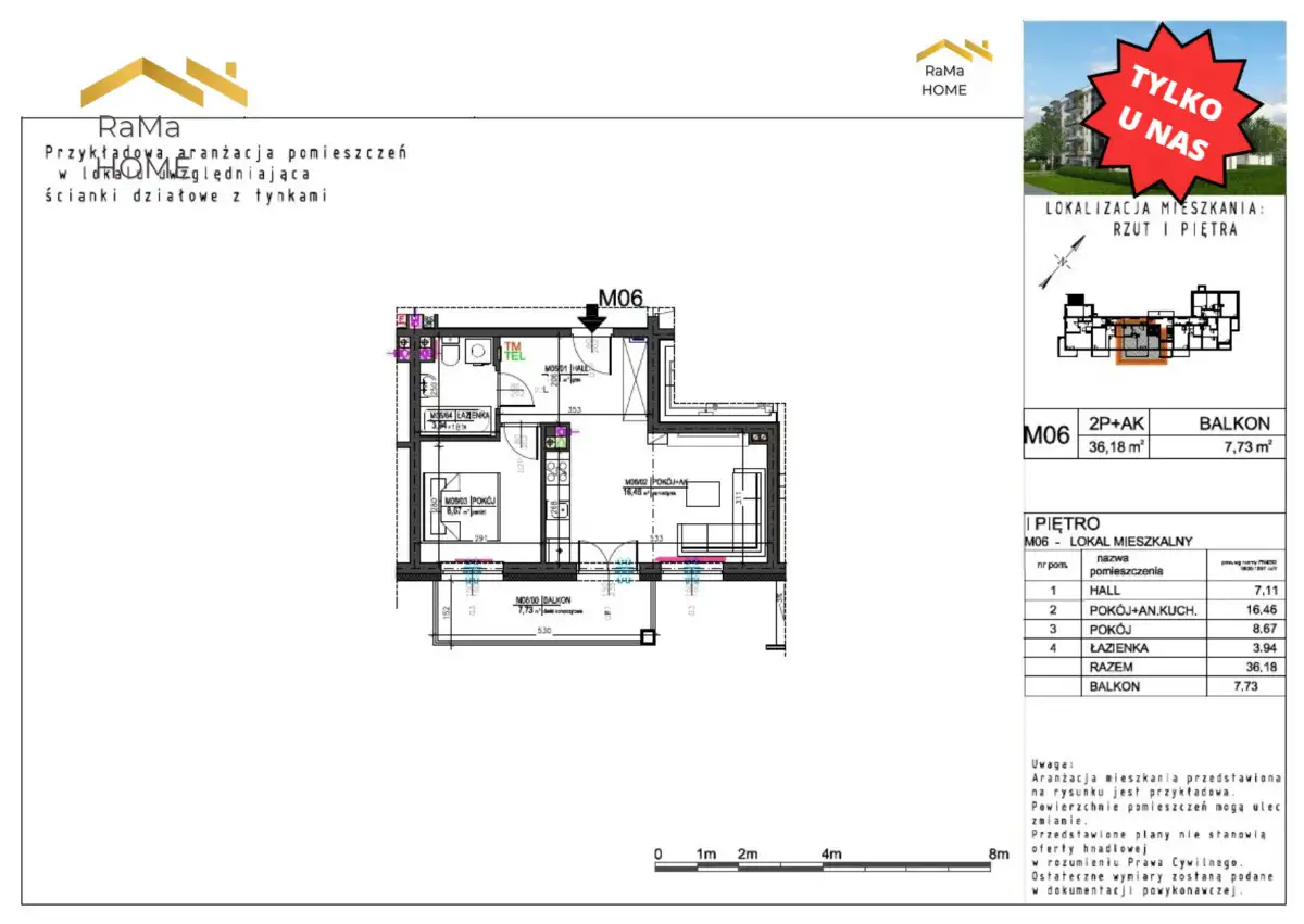 Układ mieszkania:• Salon z aneksem kuchennym (16,46 m²) z wyjściem na balkon
