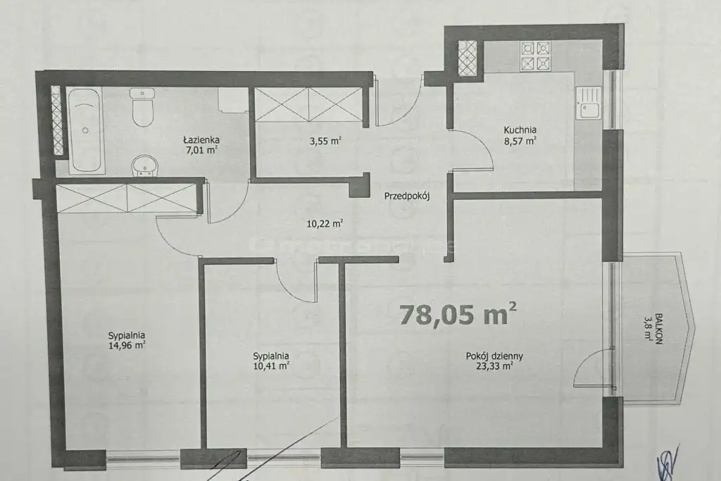 Salonu (23,33 m²) z wyjściem na balkon (3,8 m²),Oddzielnej, widnej kuchni (8,57 m²),Sypialni 1 (14,96 m²),Sypialni 2 (10,41 m²),Łazienki (7,01 m²),Przestronnego przedpokoju (10,22 m²),Garderoby/schowka (3,55 m²).