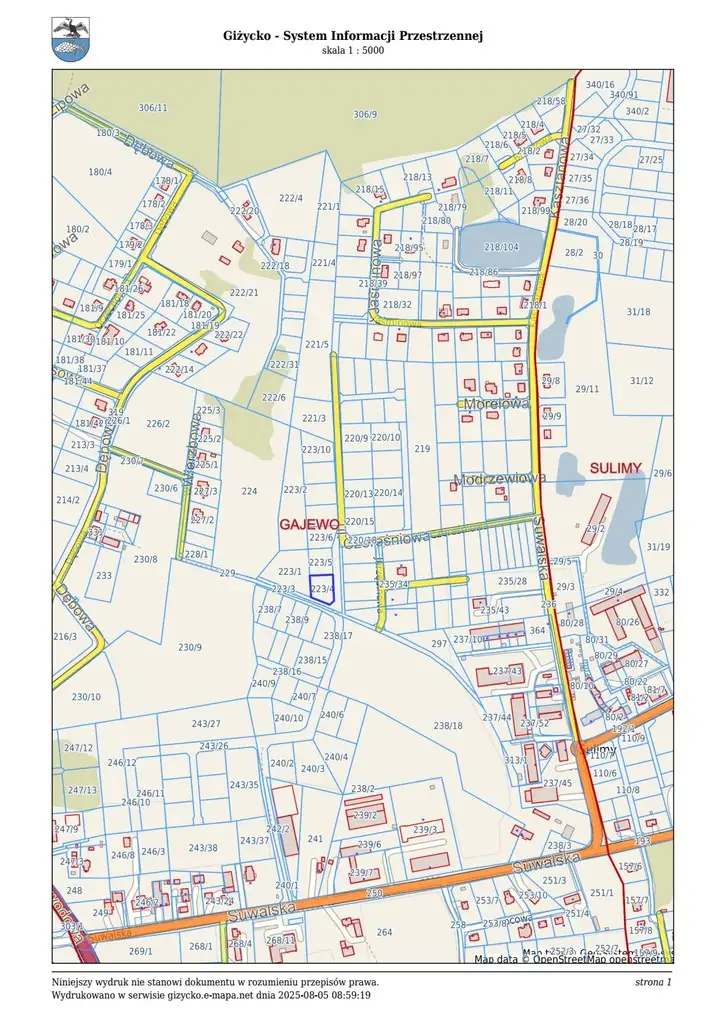 1) 223/4 o powierzchni 0,1266 ha, położona w miejscowości Gajewo, obręb geodezyjny Gajewo, gmina Giżycko dla której Sąd Rejonowy w Giżycku prowadzi księgę wieczystą OL1G/00016906/1. Wg ewidencji Gruntów i Budynków Starostwa Powiatowego w Giżycku działka oznaczona jest symbolem: RIVa – grunty orne.