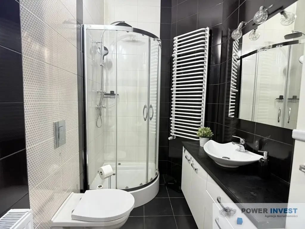 Łazienka z WC – prysznic, szafki, umywalka, lustro – gotowa do użytku.
