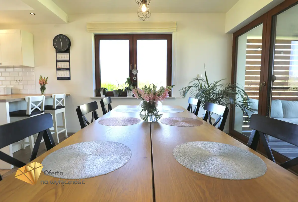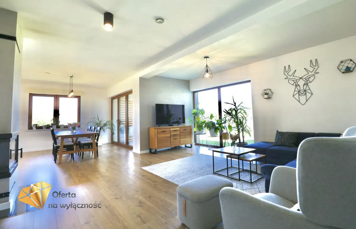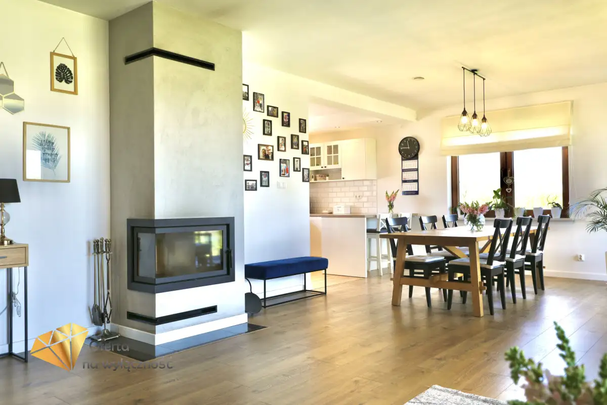 • przestronny pokój dzienny z kominkiem, jadalnią i wyjściem na ogród