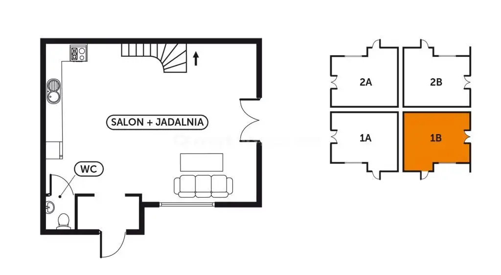 Salon połączony z kuchnią, z wyjściem na taras i ogródek przez duże, przeszklone drzwi tarasowe,