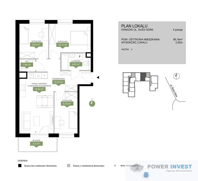 Mieszkanie znajduje się na 2 piętrze, ma powierzchnię 66,16 m² powierzchni użytkowej i składa się z: