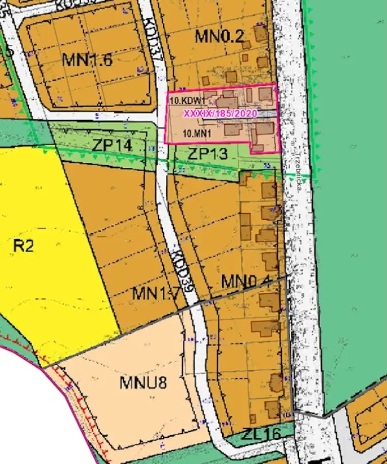 Zgodnie z ustaleniami miejscowego planu zagospodarowania przestrzennego nieruchomość oznaczona symbolem MN0.4 - przeznaczenie podstawowe - zabudowa mieszkaniowa jednorodzinna oraz przeznaczenie uzupełniające: usługi towarzyszące, z możliwością lokalizowania ich samodzielne za wyjątkiem zabudowy szeregowej, udział ich w powierzchni zabudowy nie może przekraczać 30%, z wykluczeniem działalności uciążliwych, urządzenia towarzyszące, usługi związane z naprawami i serwisowaniem samochodów i motocykli; ZP13 - tereny zieleni urządzonej – parki. Nieruchomość leży w strefie ochrony zabytków archeologicznych „OW”.