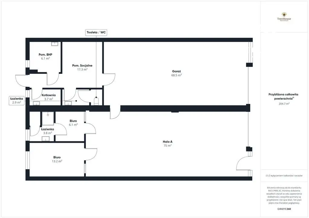 Układ pomieszczeń: Hala A – ok. 75 m²