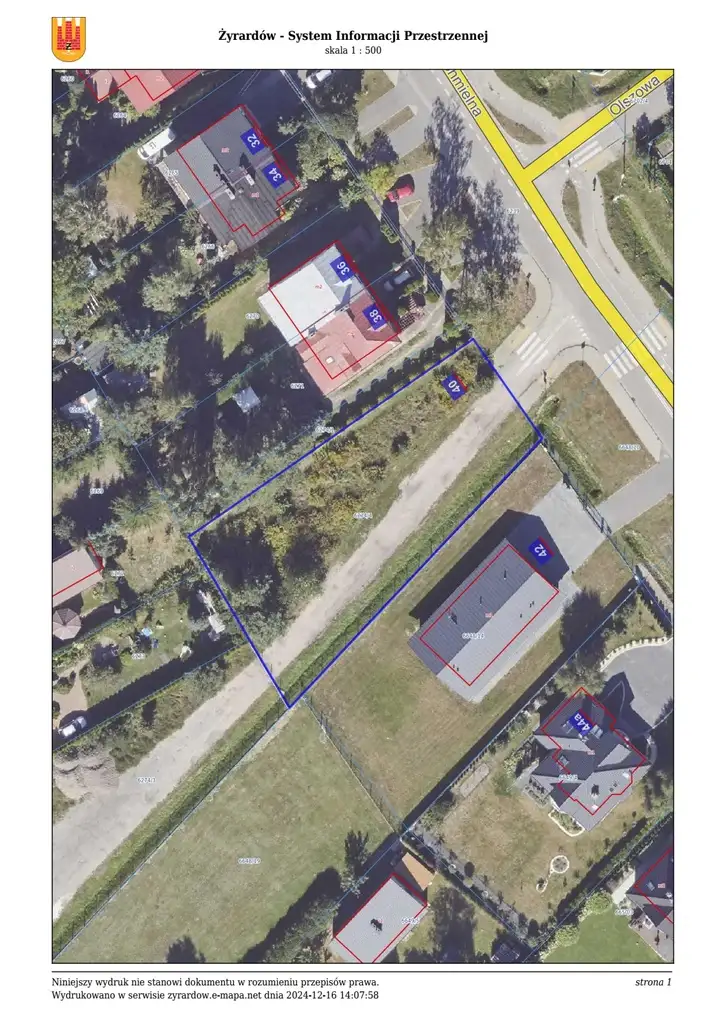 Opis nieruchomości: Nieruchomość niezabudowana i niezagospodarowana, częściowo ogrodzona, pokryta roślinnością, w kształcie regularnym, przypominającym trapez. Przez działkę przechodzi gruntowa, udeptana ścieżka, a wzdłuż granicy działki przebiega rów odwadniający.