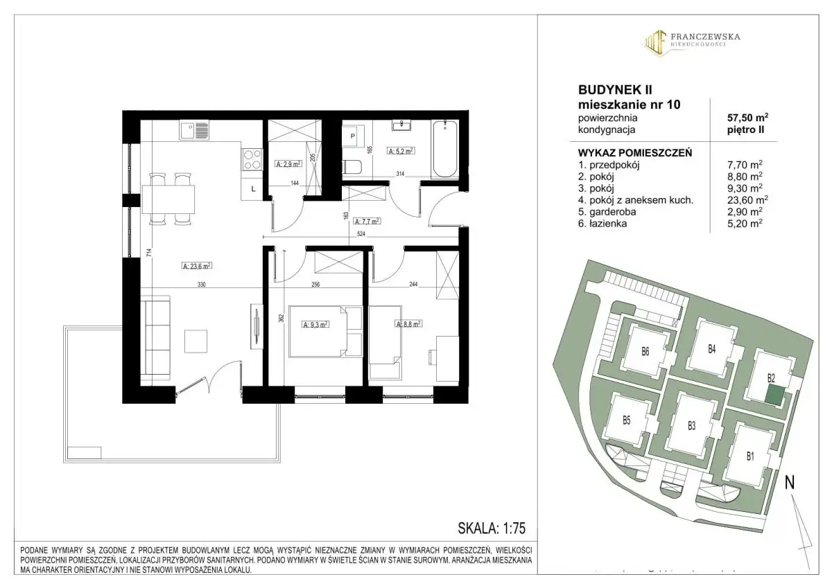 Dwupokojowe mieszkanie o powierzchni projektowej 52,70 m² na 3 piętrze w 3 piętrowym bloku.