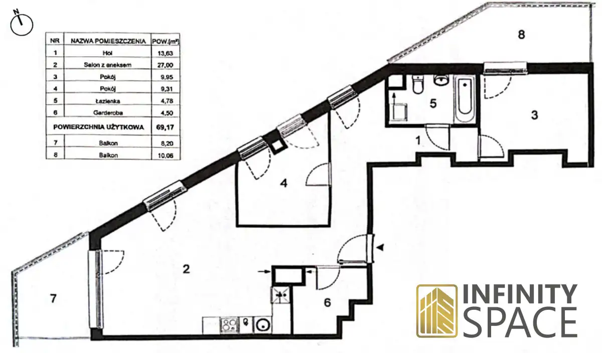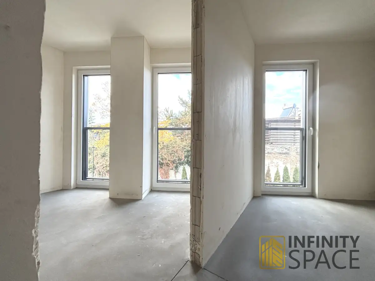 - living room with space for a kitchenette (27 m²) and access to a large balcony - windows facing west and north,