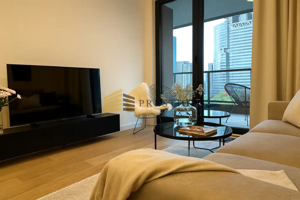 Apartament wykończony został z użyciem materiałów premium – granitowe blaty, dębowy parkiet, system klimatyzacji. Budynek objęty jest całodobową ochroną, monitoringiem oraz recepcją. Wnętrze jest w pełni umeblowane i gotowe do zamieszkania.