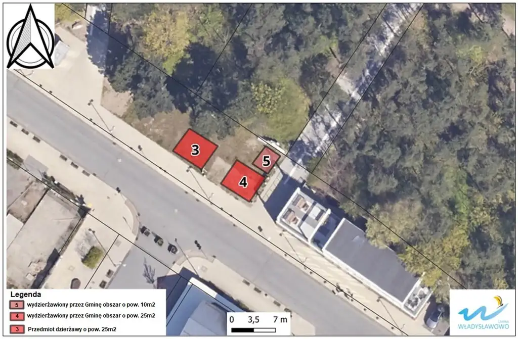 1. Część nieruchomości oznaczona nr 11/8 o powierzchni ewidencyjnej 0,7723ha położona przy ulicy Hryniewieckiego we Władysławowie, obręb ewidencyjny Władysławowo 03, objęta księgą wieczystą KW Nr GD2W/00017637/0, oznaczona jako stanowisko nr 3 o powierzchni 25m².