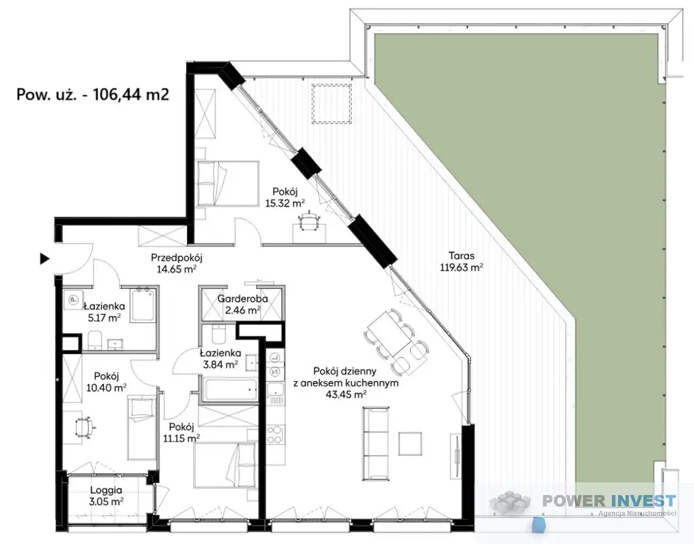 Oferowane mieszkanie znajduje się na 11 piętrze. Lokal ma powierzchnię 106,44 m² powierzchni użytkowej i składa się z: