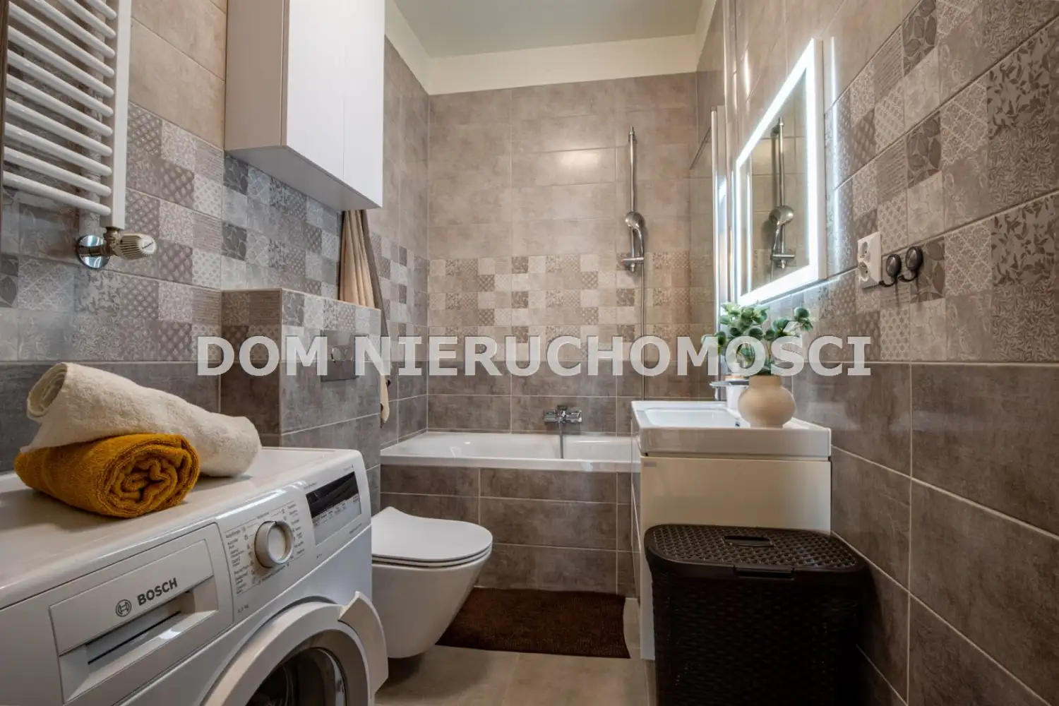 W łazience znajduję się wanna, pralka, WC oraz umywalka i lustro.