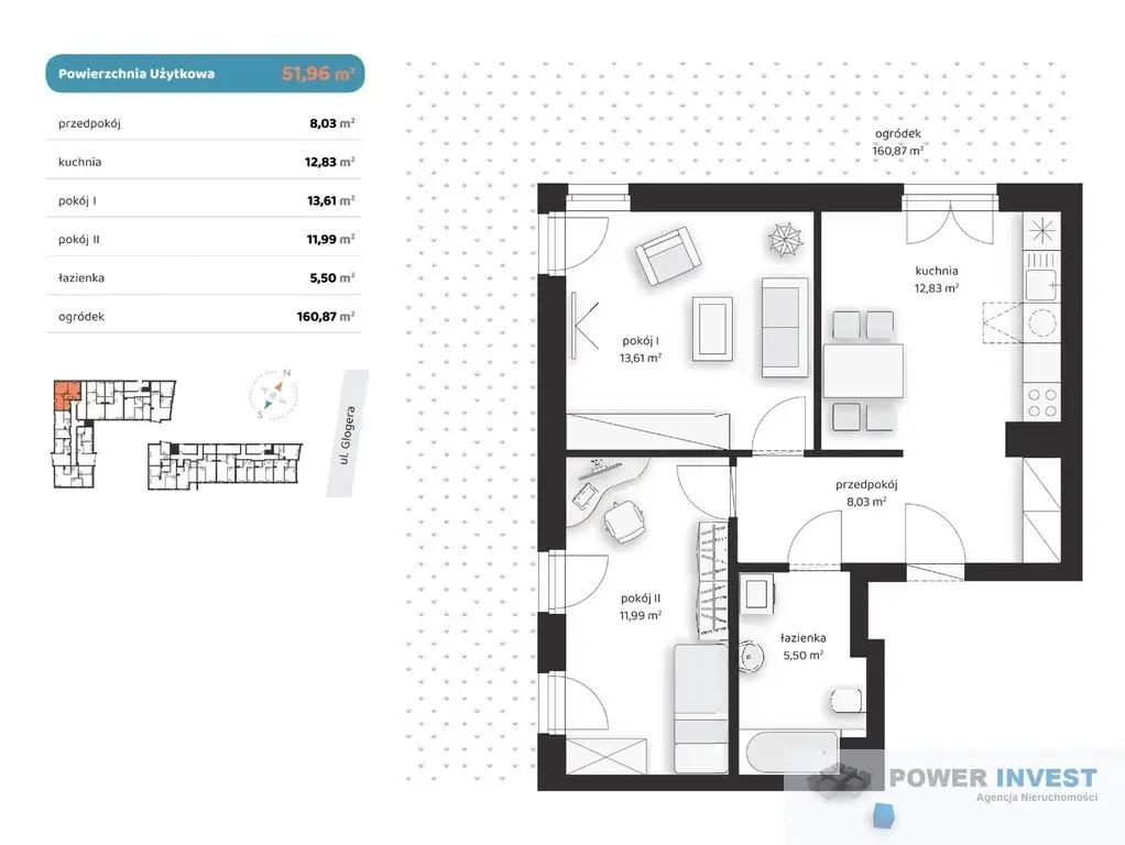 Mieszkanie znajduje się na parterze. Lokal ma powierzchnię 51,96 m² i składa się z: