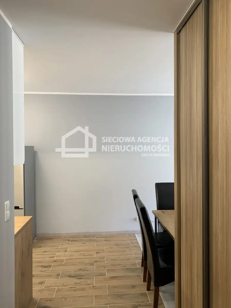 W skład mieszkania wchodzi salon z otwartą kuchnią i kompletem AGD, sypialnia, łazienka z kabiną prysznicową, WC i pralką oraz przedpokój z szafą w zabudowie.
