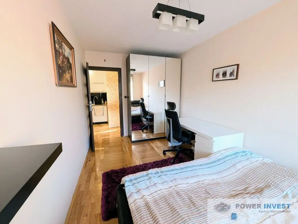 Sypialnia – z dużą, pojemną szafą oraz biurkiem do pracy.