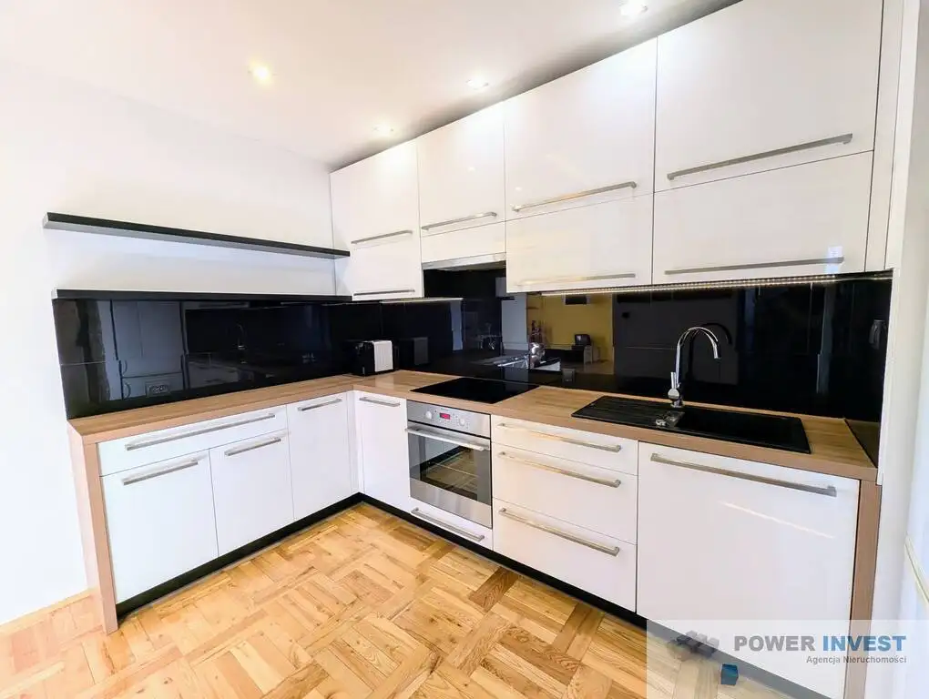 Kuchnia w kształcie litery L – w pełni umeblowana i wyposażona w sprzęt AGD: piekarnik, lodówko-zamrażarkę, mikrofalówkę, płytę indukcyjną, zmywarkę oraz wysuwany okap.