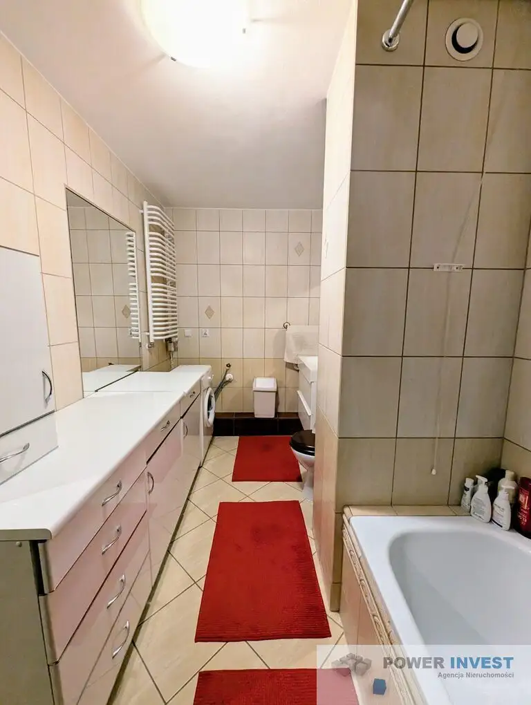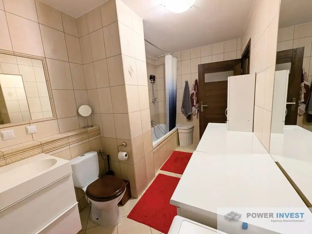 Łazienka – z wanną z funkcją prysznica, umywalką, WC, pralką i zestawem mebli łazienkowych.