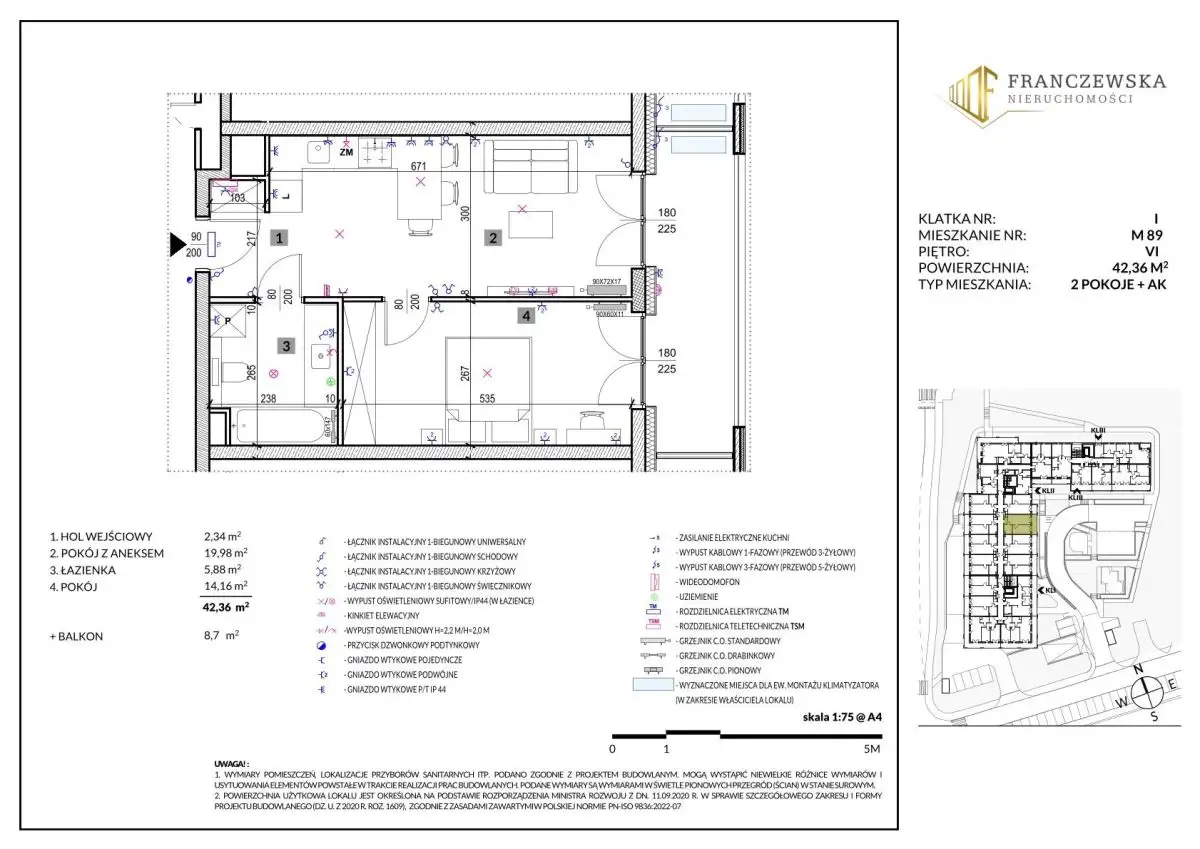 Dwupokojowe mieszkanie o powierzchni 42,36 m² na 6 piętrze w 7-piętrowym budynku na nowoczesnym osiedlu na Czechowie w Lublinie.