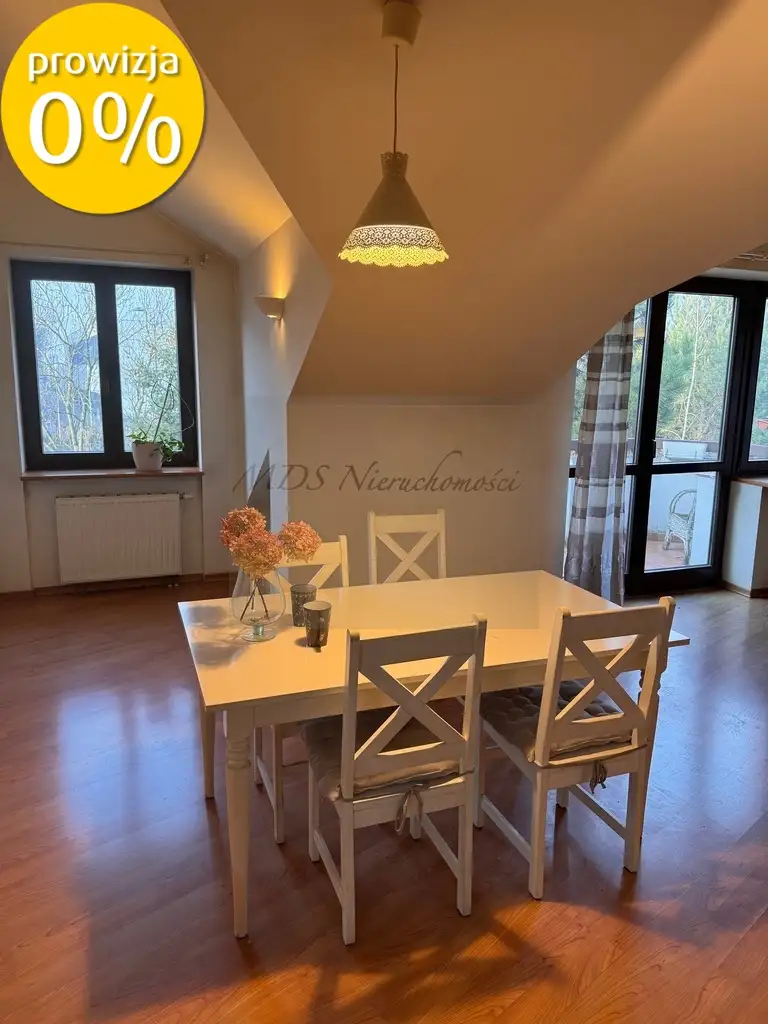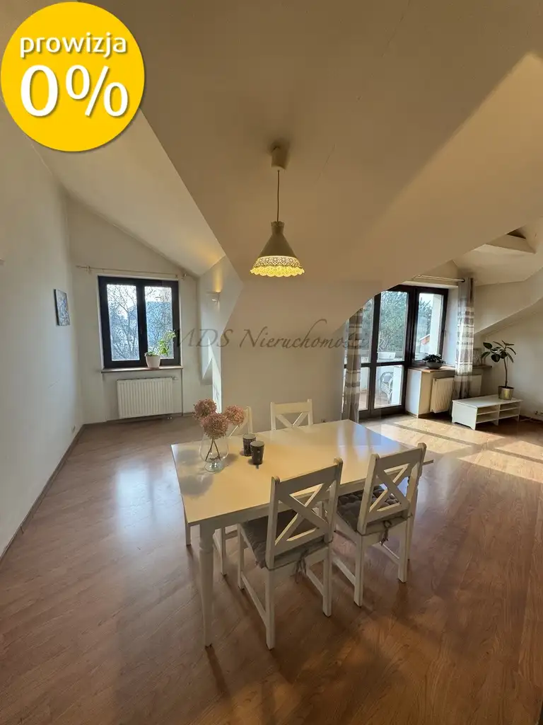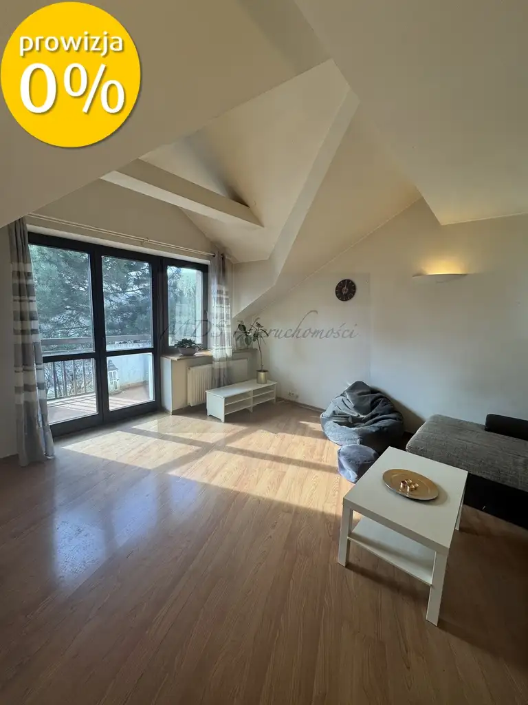 The large living room with sloping ceilings has a balcony facing west, onto Nowoursynowska Street, which is sheltered by beautiful pine trees growing in the garden.