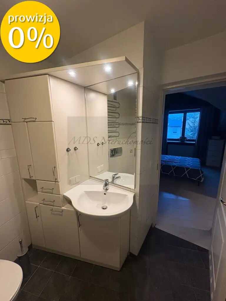 Wprost z sypialni wchodzi sie do łazienki. Łazienka wyposażona jest w wannę z opcją prysznica, ma dużą wnekę na pralkę i suszarkę oraz umywalkę w zabudowie z wieloma szufladami do przechowywania.