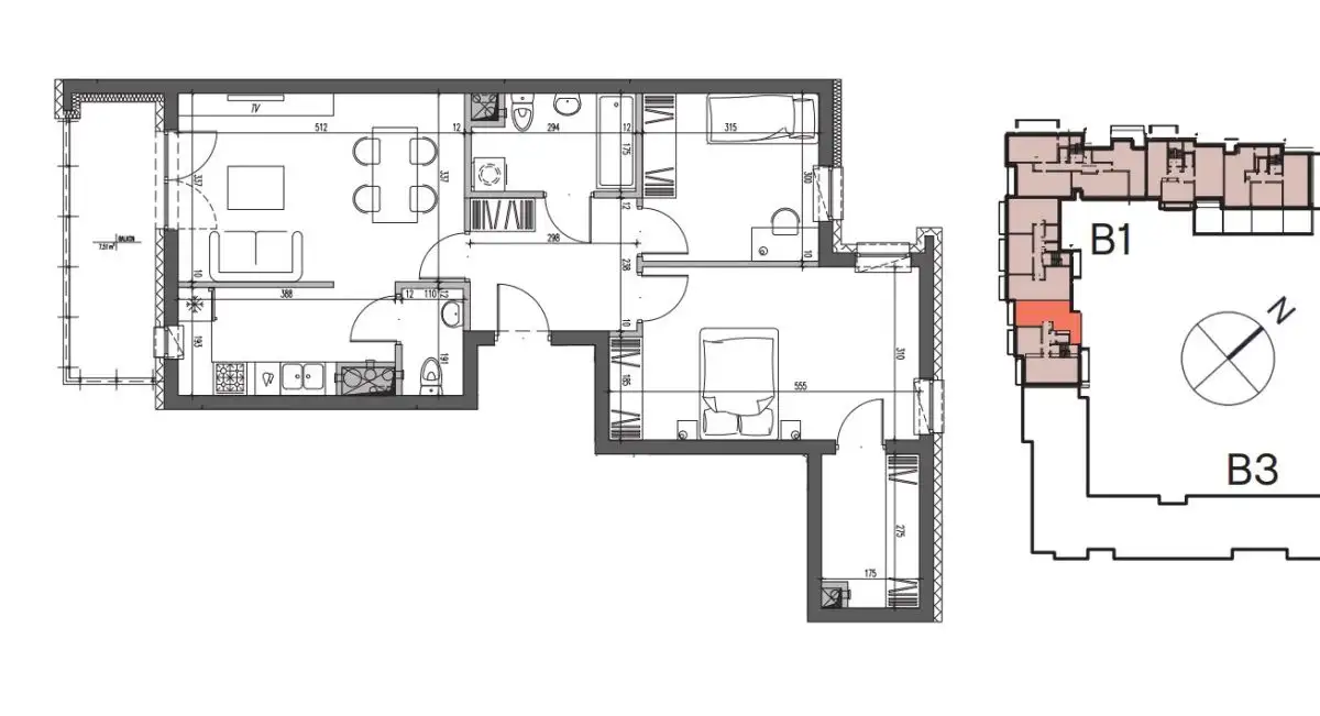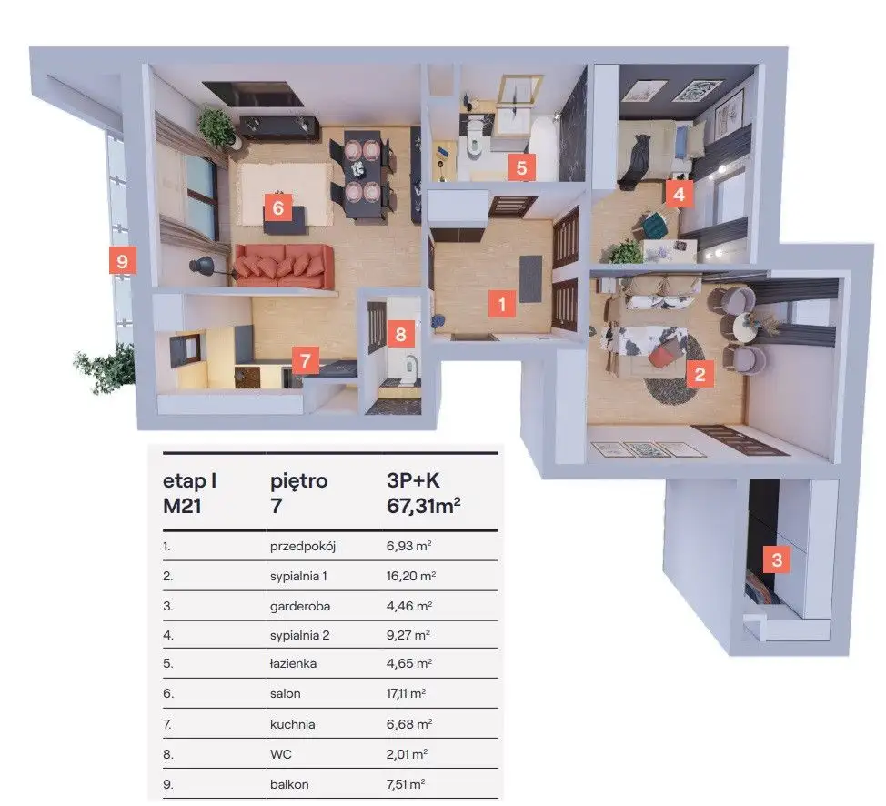 Trzypokojowe mieszkanie o powierzchni projektowej 67,31 m² z wystawą okien na północny-wschód i południowy-zachód