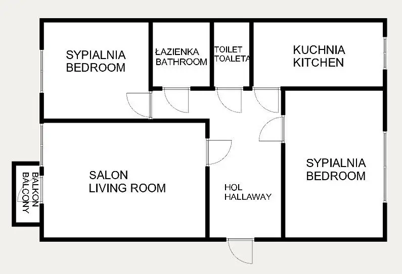 Pokoje: sypialnia, pokój, salon z wyjściem na balkon, hol, łazienka, toaleta, kuchnia;