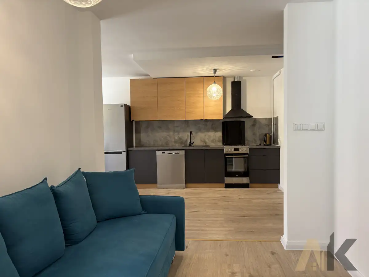Wyposażenie: Mieszkanie jest w pełni umeblowane i wyposażone w sprzęt AGD (lodówka, zmywarka, pralka, kuchenka). W salonie znajduje się stół z krzesłami, rozkładana sofa.