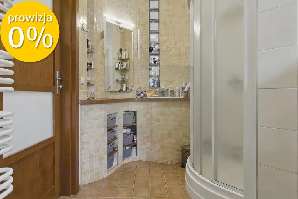Łazienka o powierzchni 9 m² jest domowym spa, z narożną wanną z hydromasażem, kabiną prysznicową oraz umywalką z toaletką. Znalazł się w niej także schowek na pralkę i suszarkę ukryte za roletą.