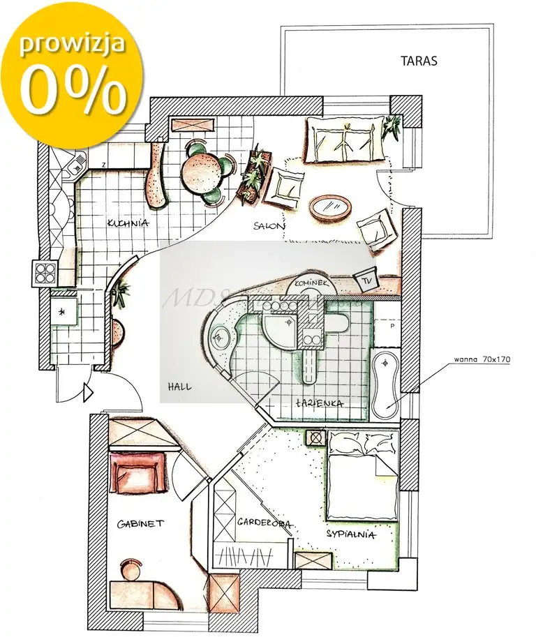 Three-room apartment with an area of 73.1 m² with a large, sunny terrace and a parking space in the gated community of Borki - Wawer Zerzeń.