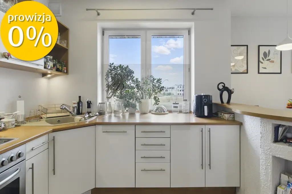 Kuchnia (ok 9 m²) z dużym oknem na południe jest częściowo oddzielona od salonu, w pełni wyposażona (płyta elektryczna, piekarnik, lodówka, zmywarka) ma także zamkniętą część stanowiącą spiżarnię/domowy schowek.