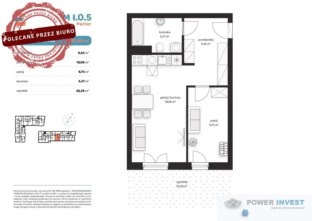 - salon z kuchnią i wyjściem na taras: 19,08 m²