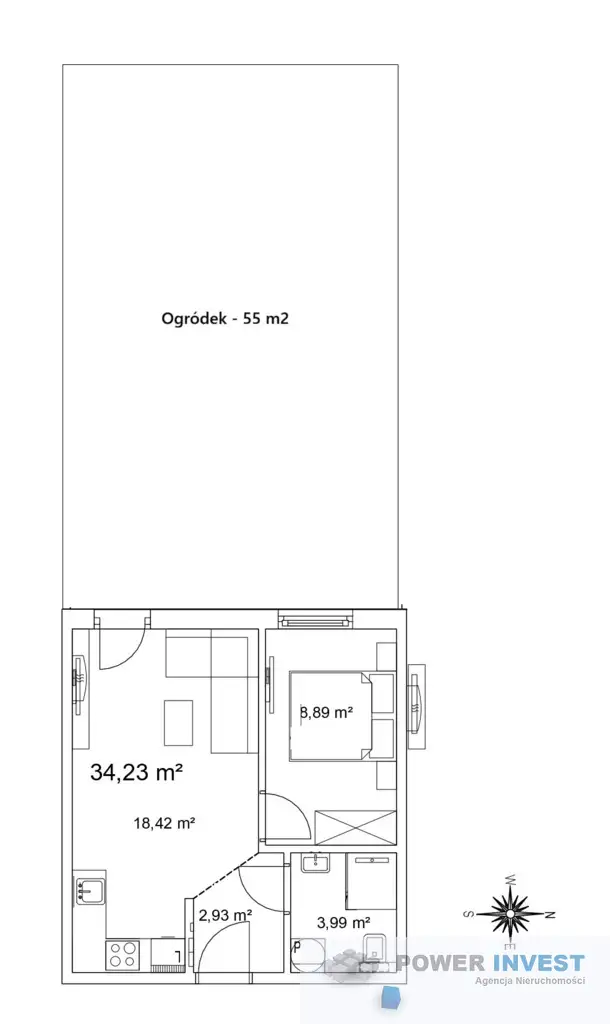 Mieszkanie znajduje się na parterze. Lokal ma powierzchnię 34,23 m i składa się z: