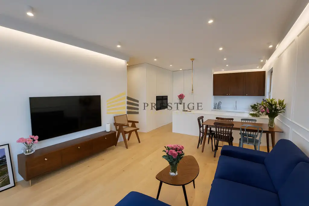 The apartment features a large number of wardrobes, a spacious kitchen, a large bathroom with a bathtub and shower, a light birch wooden floor and a huge number of independent light points with dimmers.