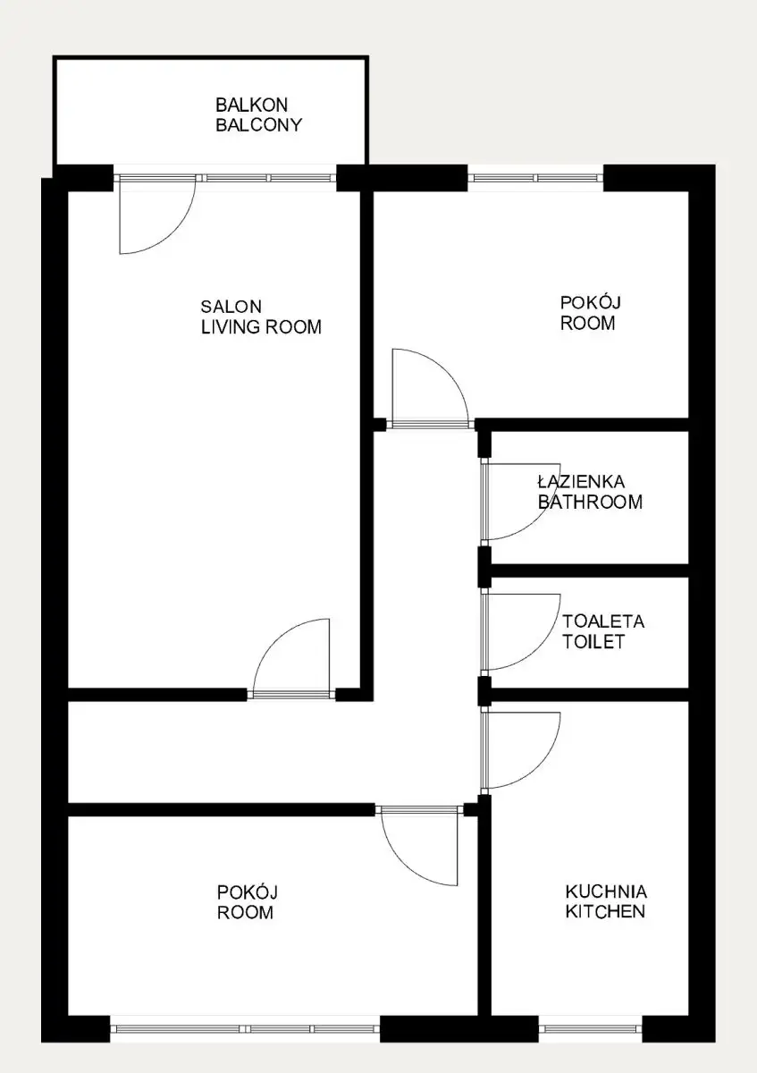 Pomieszczenia: 3 oddzielne pokoje, oddzielna kuchnia, łazienka, toaleta, korytarz, balkon typu loggia