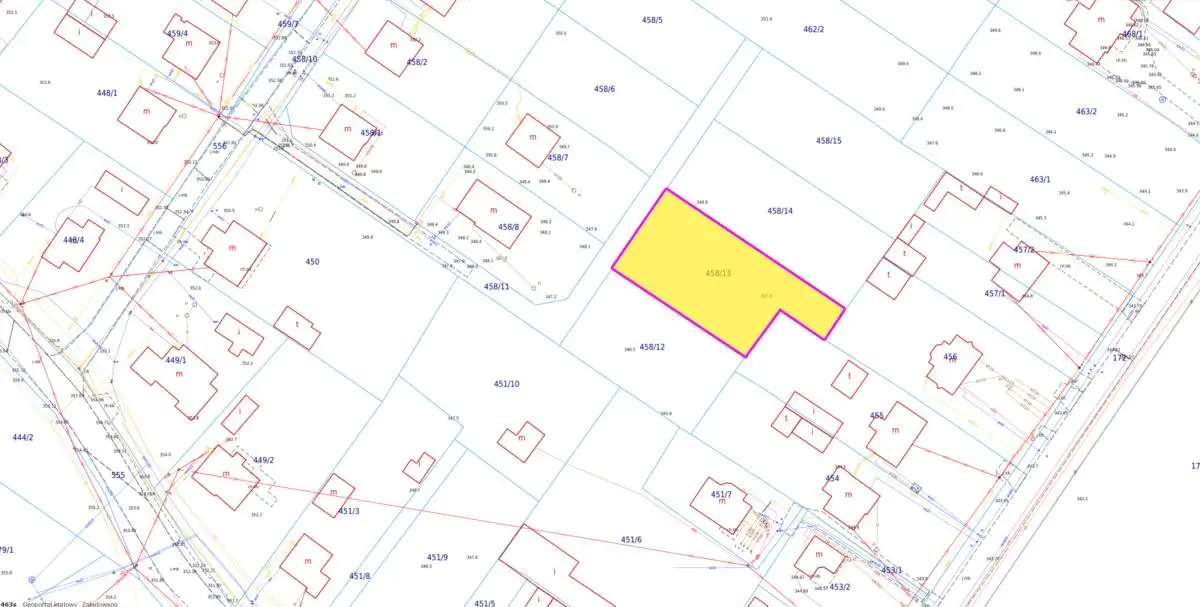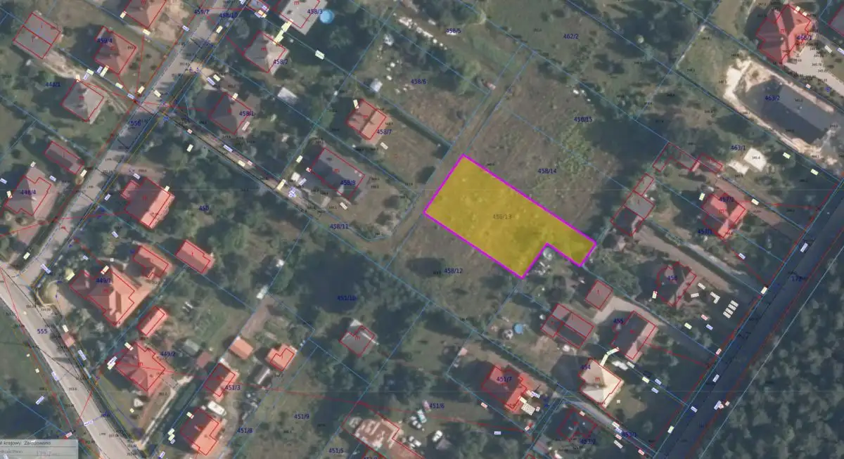 - Kształt i wymiary: Działka o numerze 458/13 ma powierzchnię 1035 m² i jest zbliżona kształtem do prostokąta, co ułatwia zagospodarowanie terenu.