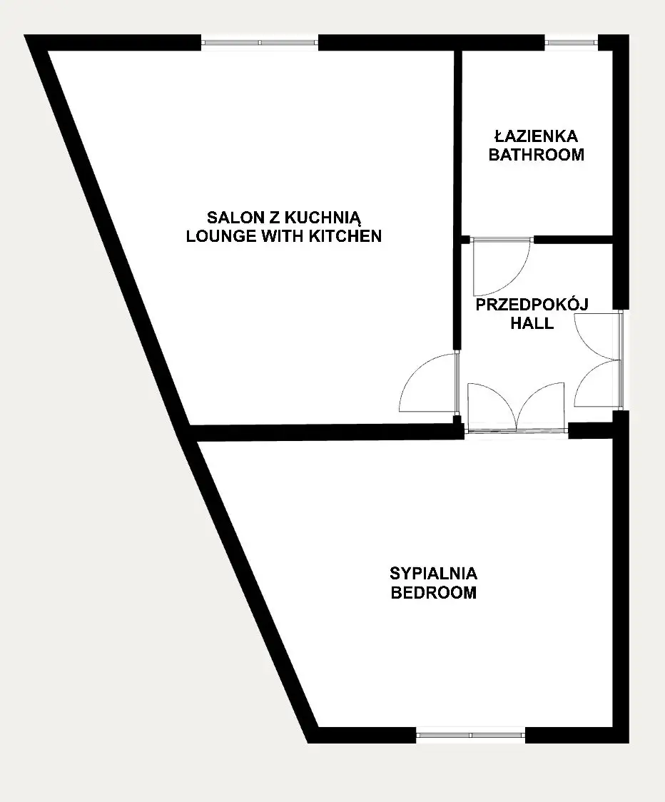 Pokoje: sypialnia, przedpokój, salon z kuchnią, łazienka