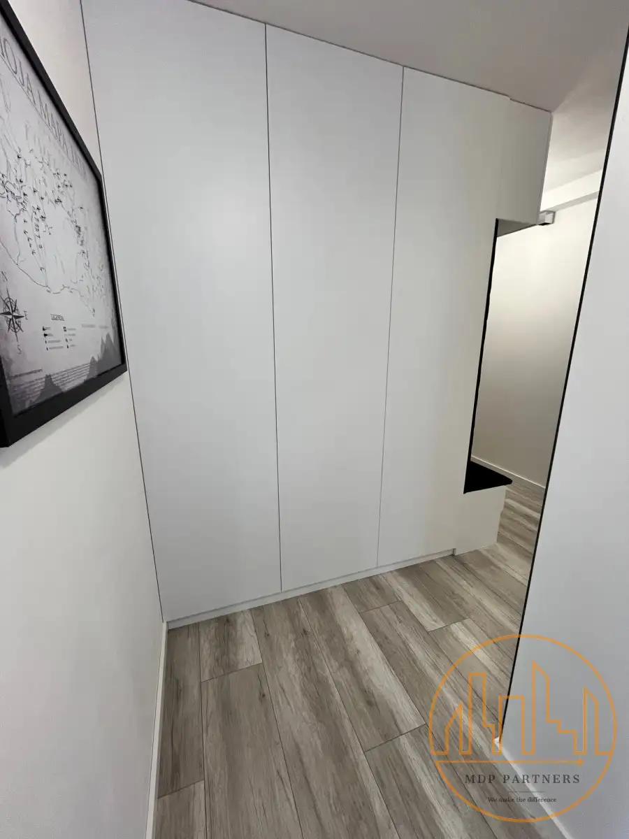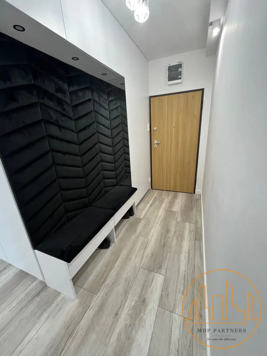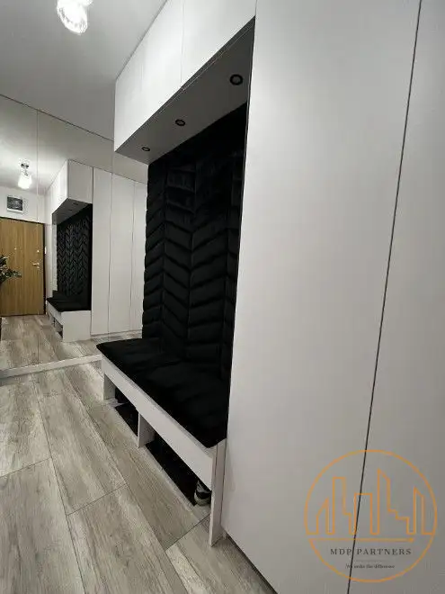 Korytarza (10,79 m²) - przestronny, z szafą na wymiar i siedziskiem.