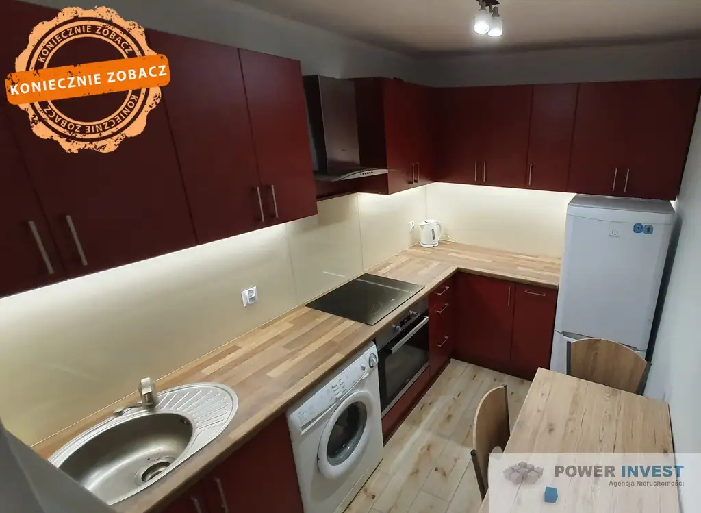 W pełni umeblowana i wyposażona kuchnia: płyta elektryczna, piekarnik, lodówka z zamrażarką, pralka oraz drobne AGD.