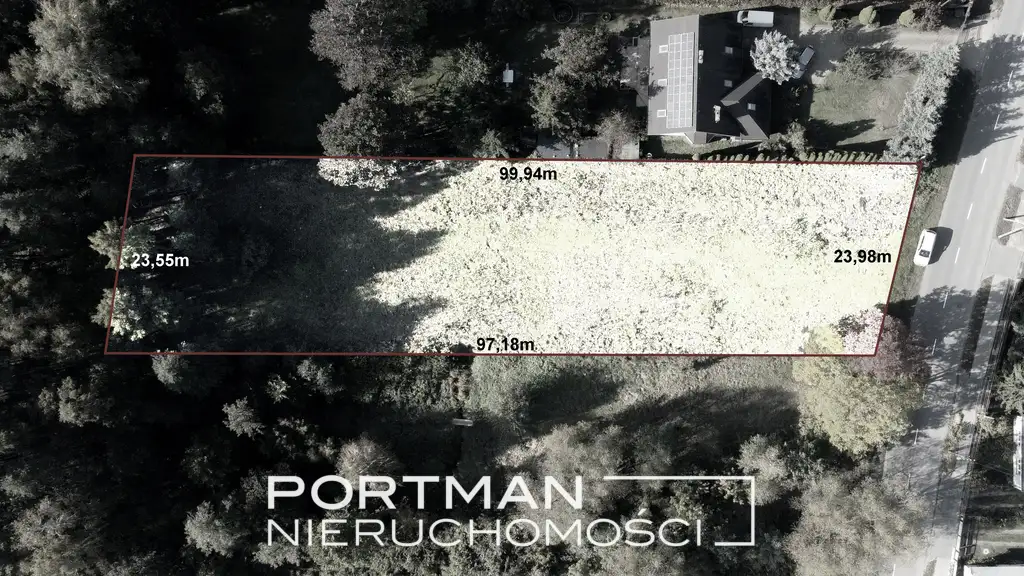 Działka w kształcie prostokąta o wymiarach 23,5 x 98 metrów. Dojazd drogą asfaltową. W bezpośrednim sąsiedztwie niska zabudowa jednorodzinna. Działka graniczy bezpośrednio z dużym obszarem leśnym. należącym do Lasów Państwowych.