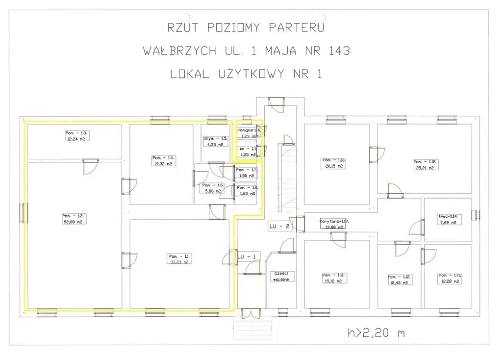 • Lokal użytkowy nr 1 położony na parterze po lewej stronie od głównego wejścia do budynku. Składa się z 3 pomieszczeń o funkcji biurowej, umywalni, trzech pomieszczeń z WC i pomieszczenia gospodarczego. Funkcjonalność lokalu średnia. Powierzchnia użytkowa lokalu wynosi 131,01 m². Do lokalu przynależy WC o powierzchni 1,55 m², pom. gospodarcze o powierzchni 1,29 m² oraz piwnica o powierzchni 13,77 m², wraz z udziałem w częściach wspólnych 18,18%.