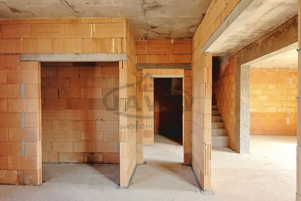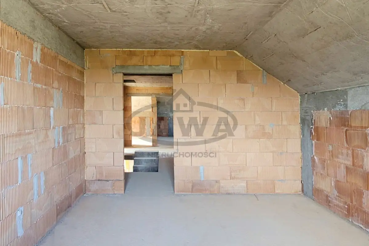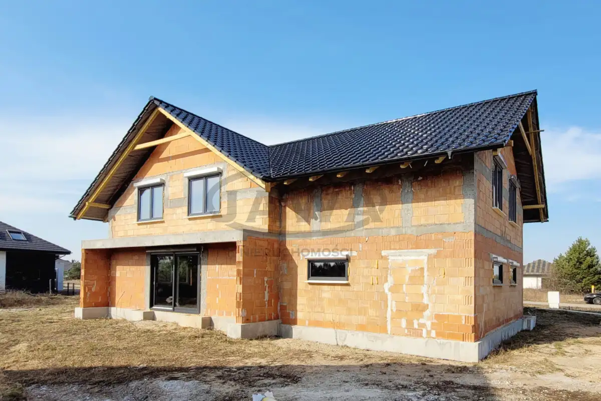 Dom jednorodzinny w stanie surowym zamkniętym z poddaszem użytkowym. Jest to budynek wolnostojący o powierzchni użytkowej ponad 200 metrów kwadratowych na działce 1021 m², z wbudowanym dwustanowiskowym garażem, z dachem krytym dachówką ceramiczną. Działka od południa ogrodzona siatką systemową, jest też wylany fundament pod ogrodzenie murowane. Do domu doprowadzone woda i kanalizacja. Skrzynka z prądem przy działce.