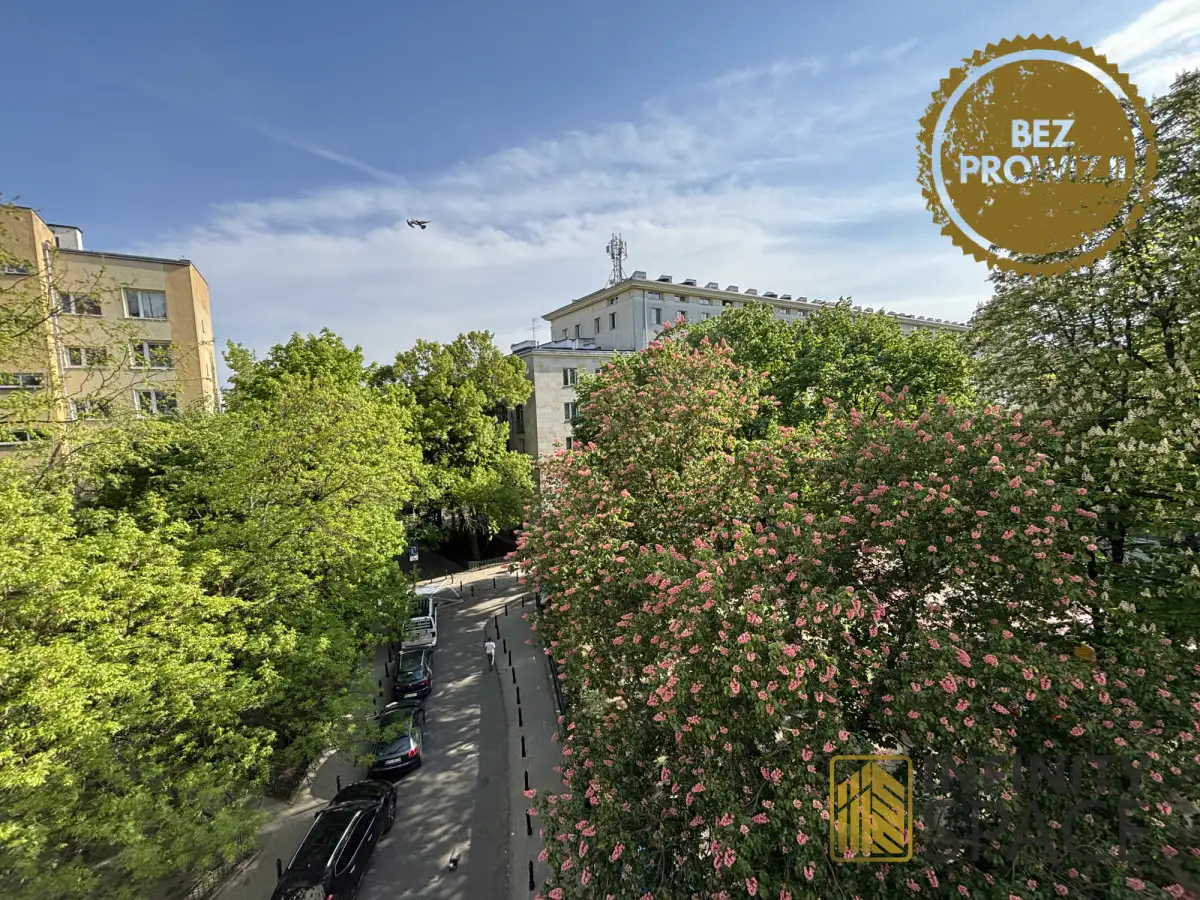 Mieszkanie jest słoneczne z uwagi na ekspozycję południowo-wschodnią i wysokie piętro, a z okien widzimy wysokie, aktualnie kwitnące drzewa.