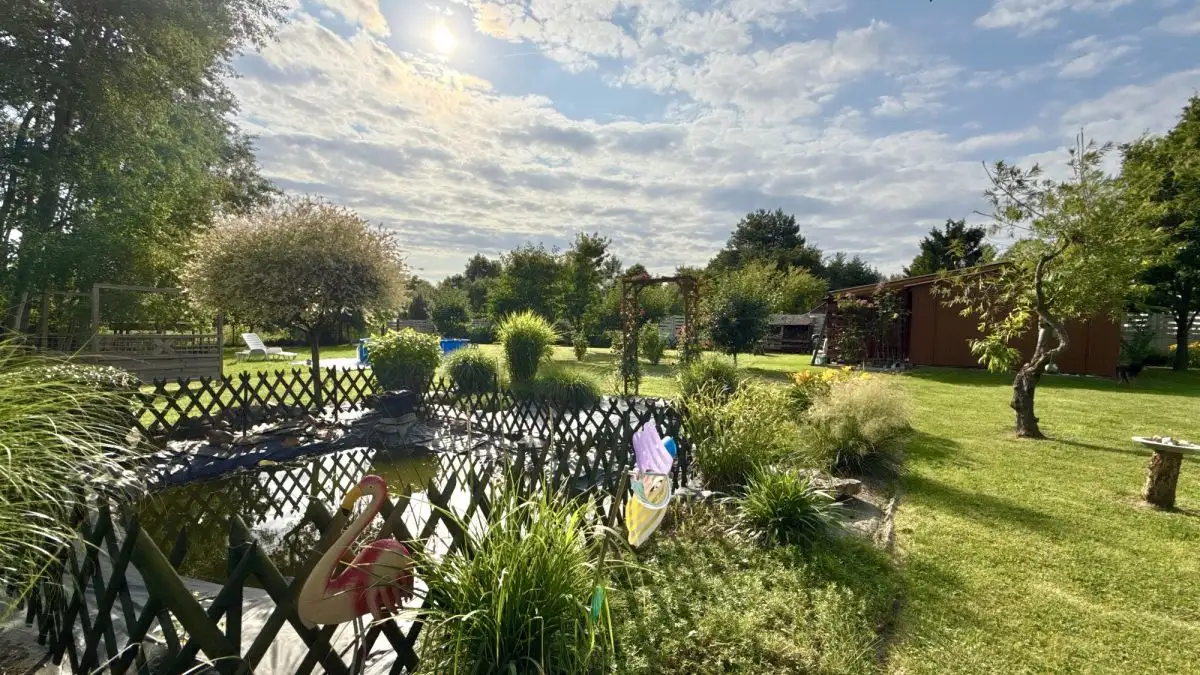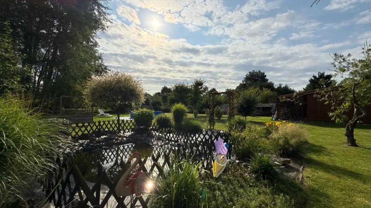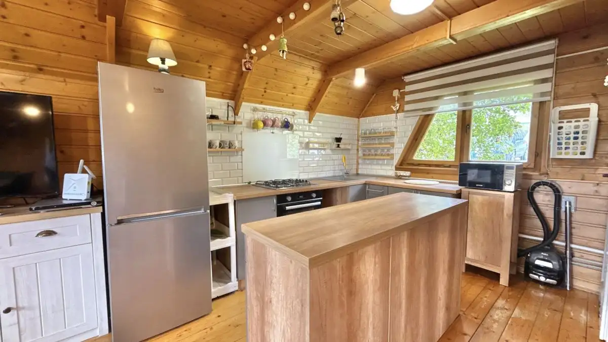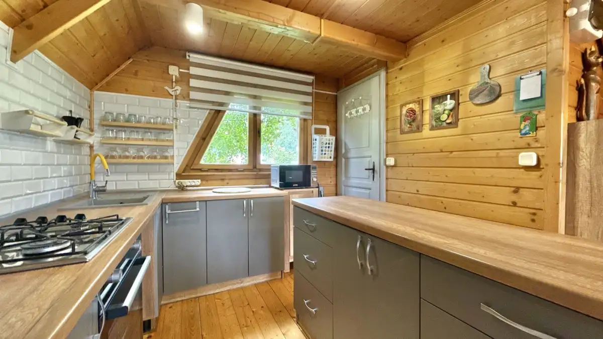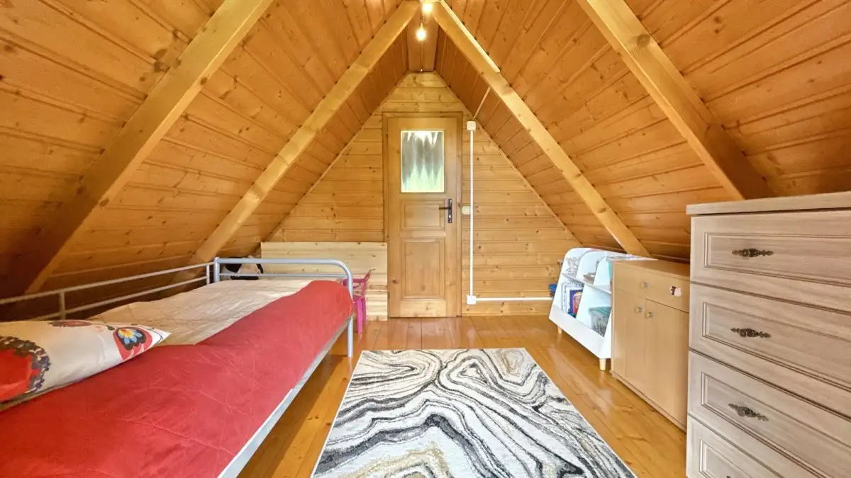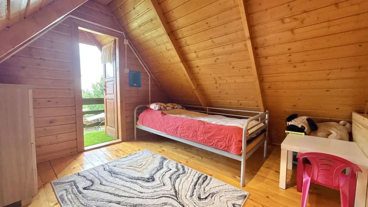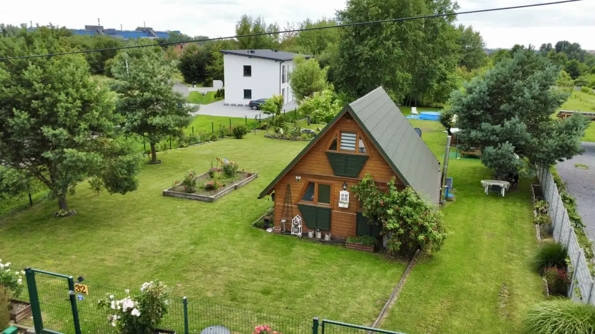 Na działce znajduje się urokliwy drewniany domek letniskowy o powierzchni 55 m², składający się z kuchni, salonu, łazienki, dwóch sypialni na piętrze oraz balkonu i tarasu. Dom jest docieplony styropianem (20cm), na dachu znajduje się blacha, a w środku kominek.