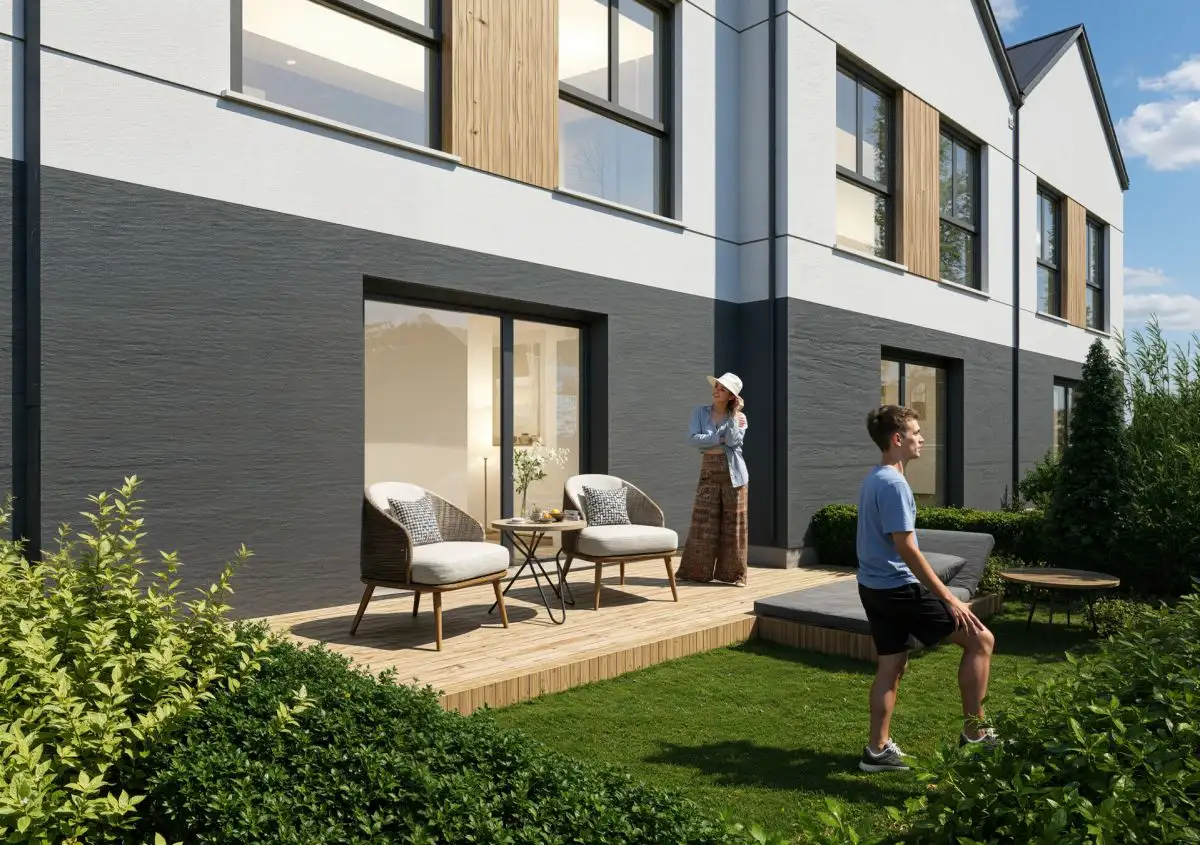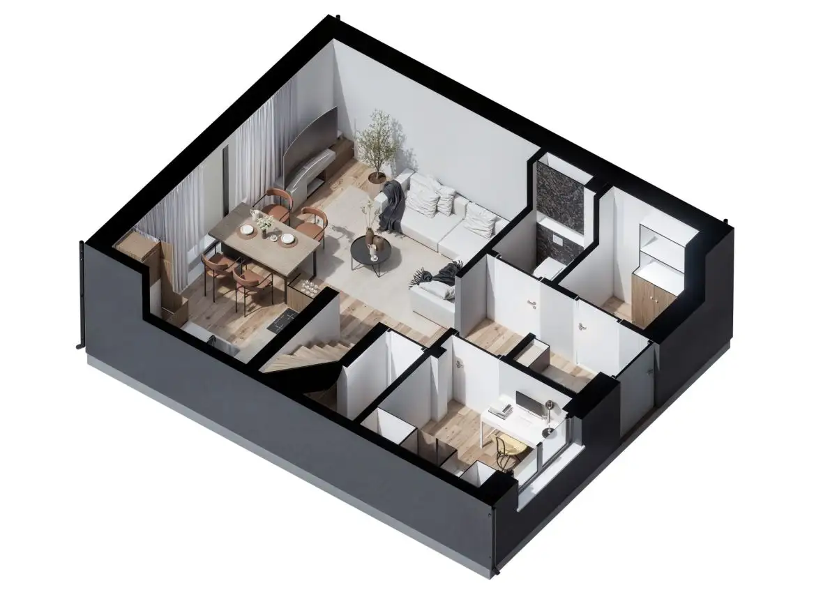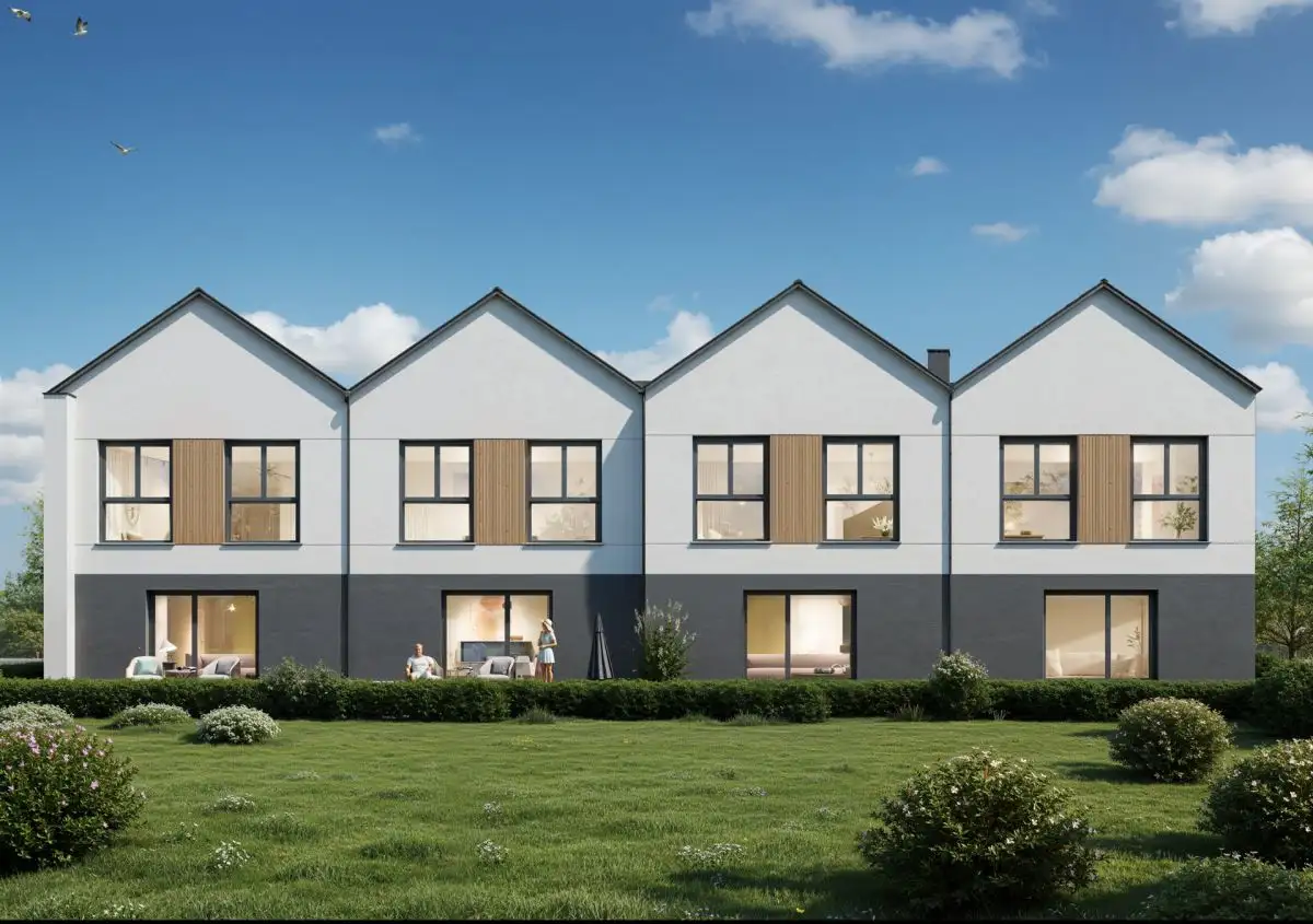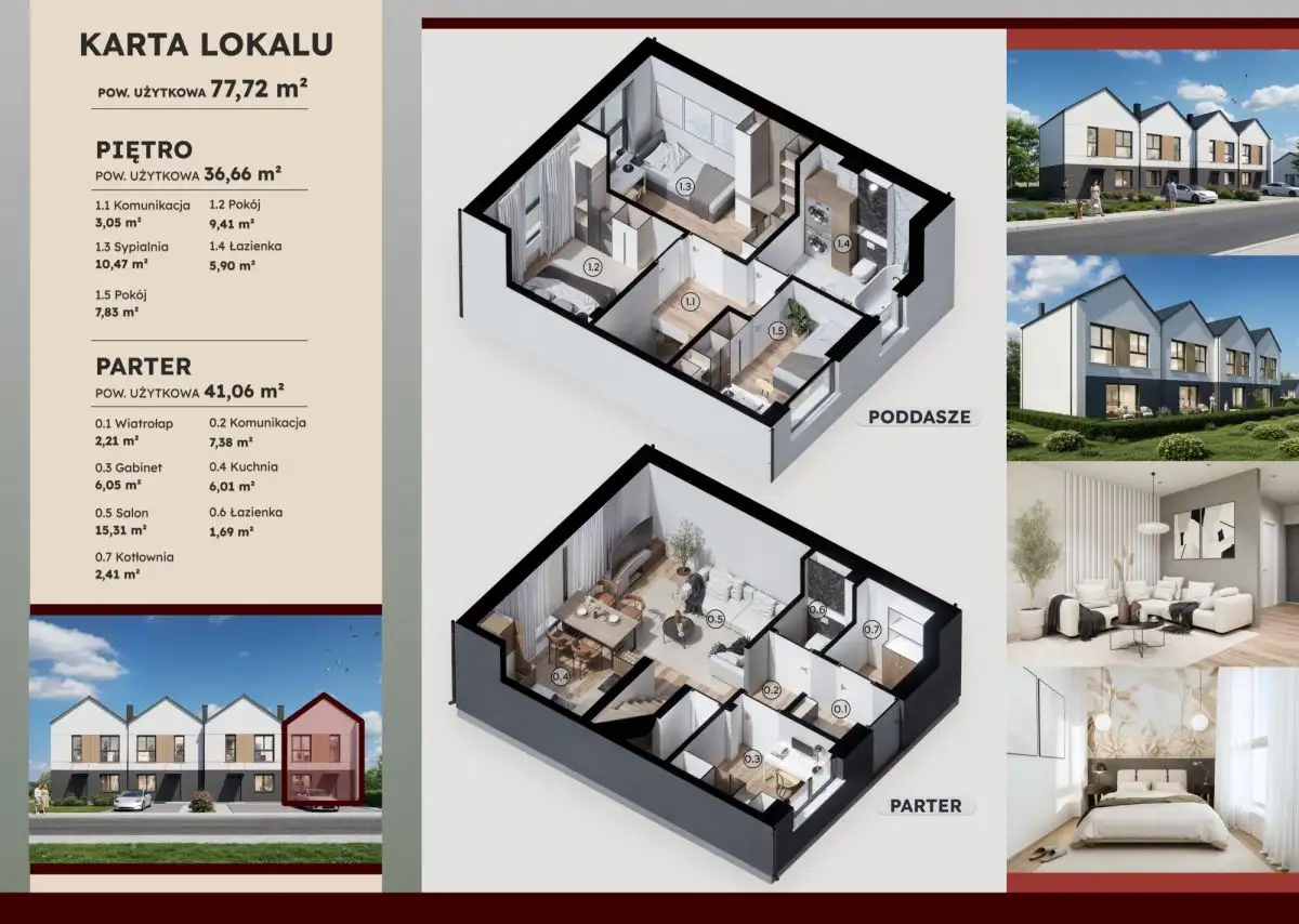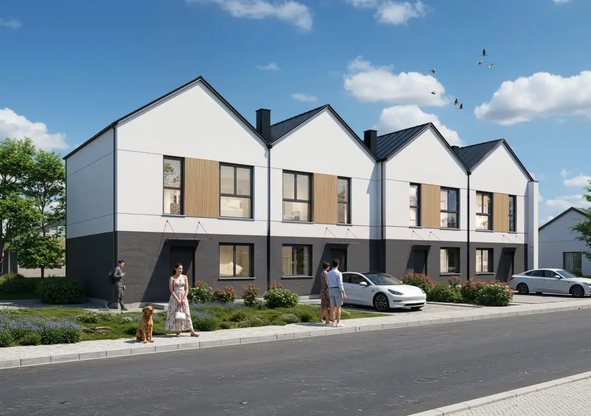 Dom w zabudowie szeregowej, skrajny segment, oddawany w stanie deweloperskim w IV kwartale 2026 roku. Powierzchnia 77,72 m², działka około 250 m² z opaską i podjazdem z kostki brukowej na 2 samochody.