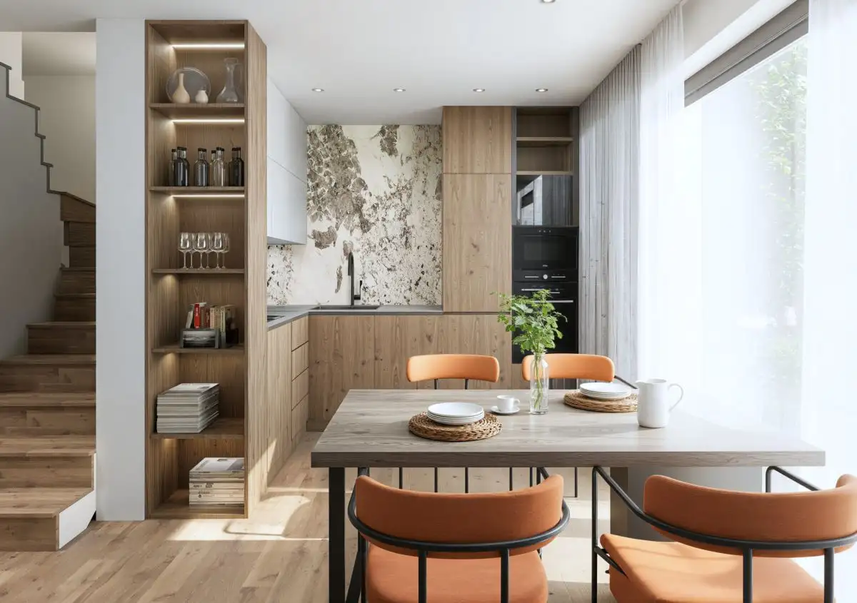 - pokój dzienny z aneksem kuchennym ( 21,32 m²) i wyjściem do niewielkiego ogródka.
